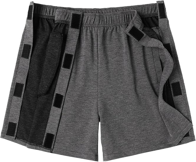 The men's breakaway shorts are designed with 2 sides full tear away side hooks and loops, from top waist to bottom with Magic Sticker. The shorts are easy to unfasten from both sides in a second, no need to take off your sports shorts. It's definitely a must-have for anybody with limited mobility, perfect for post hip/leg/knee surgery patients' recovery therapy