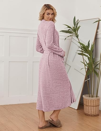 Soft robe, lightweight and slightly stretchy. The material is a comfortable jersey knit that drapes softly on the body